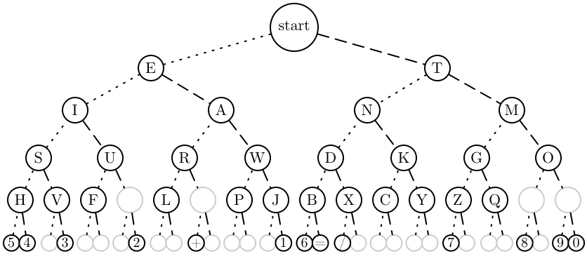 Met dit diagram kun je snel de letters opzoeken die bij de morse seinen horen.