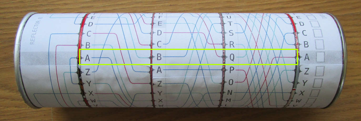 De rotors staan nu op ABQ, en daarmee kun je (in dit voorbeeld) de eerste letter