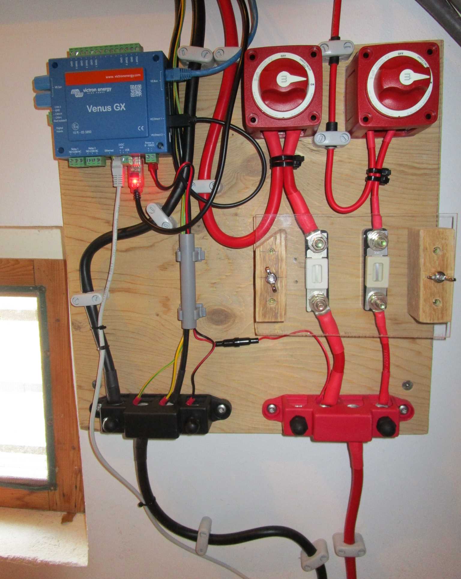 Linksboven de Venus GX, en daarnaast de twee accuschakelaars.
