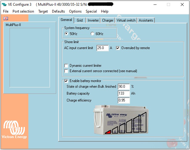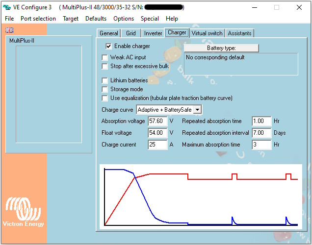 De charge current staat hier op 25 A, in de remote console staat hij op 20 A,