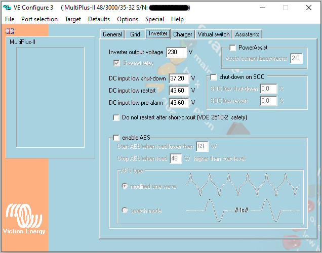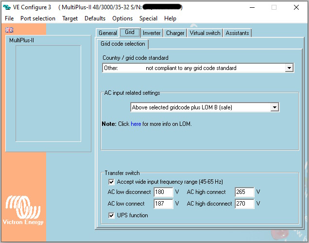 Op aanraden van mijn Victron leverancier, heb ik bij de Grid Code "other"