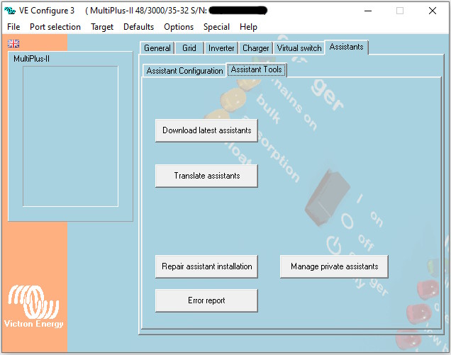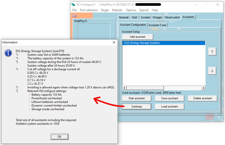 Via het scherm "Assistant Configuration" gaan we de Multiplus-II vertellen dat hij zich als Energy Storage