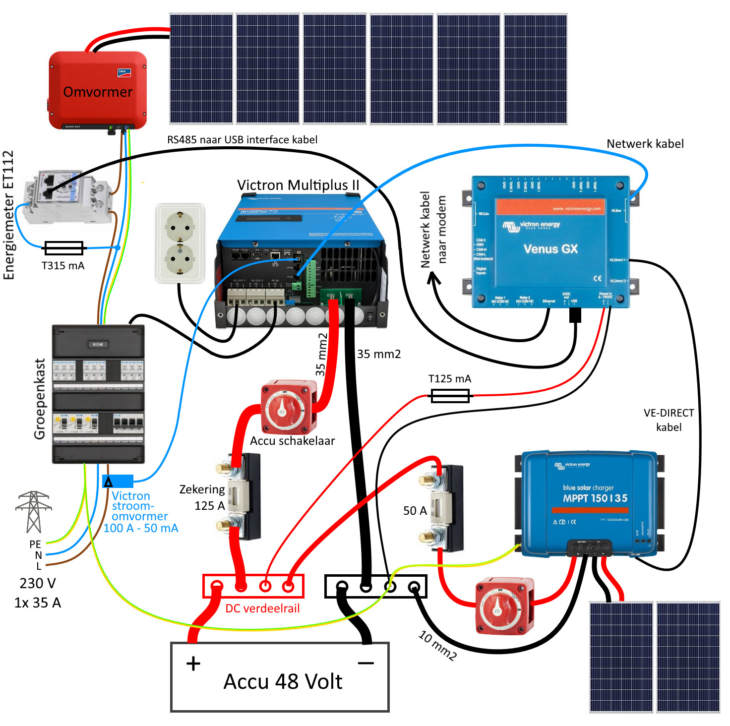 De AC-IN aansluiting is via een eigen 16A zekeringautomaat (in de groepenkast)
