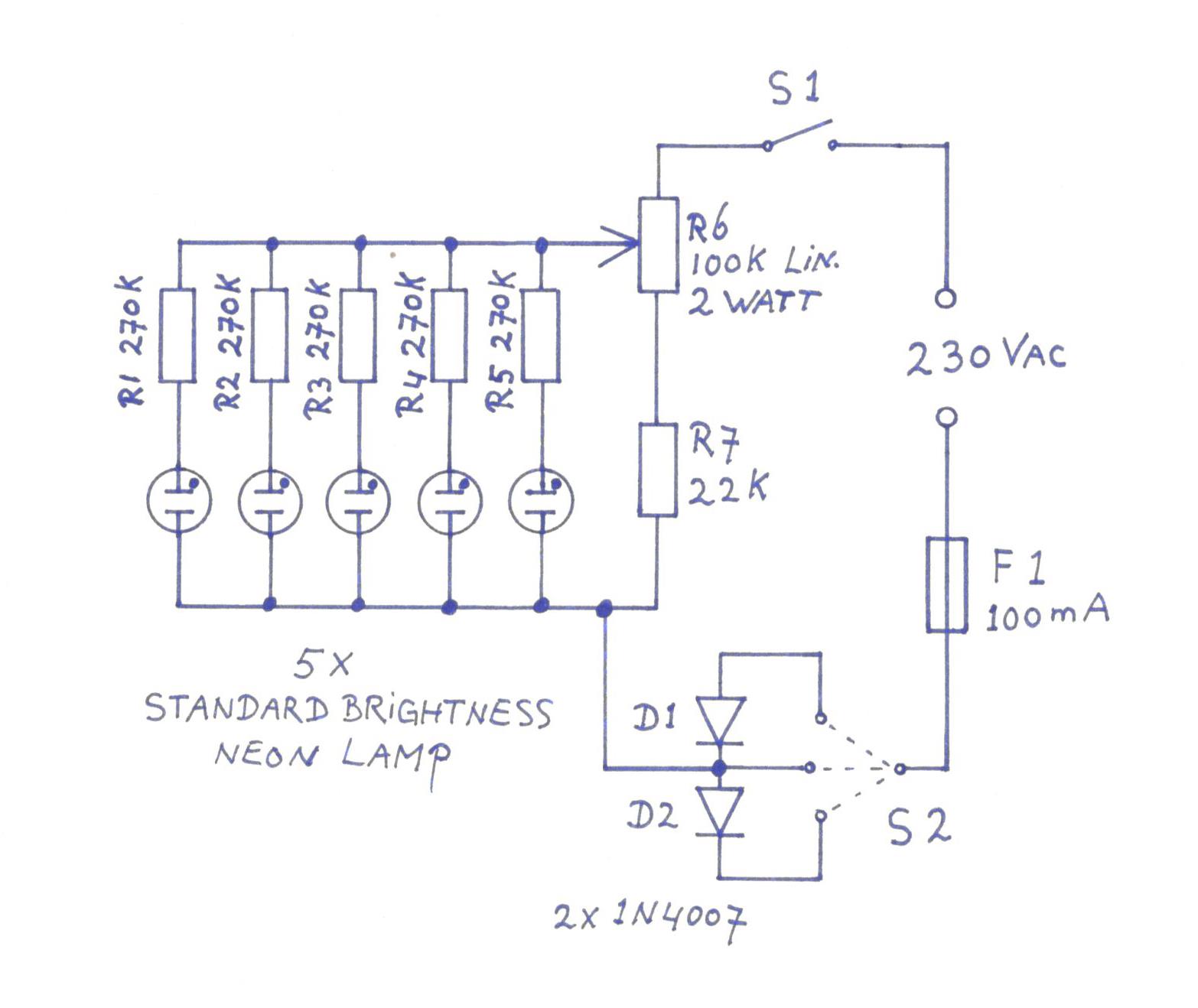 With the 3 position switch (S2) you can select which electrodes of the neon