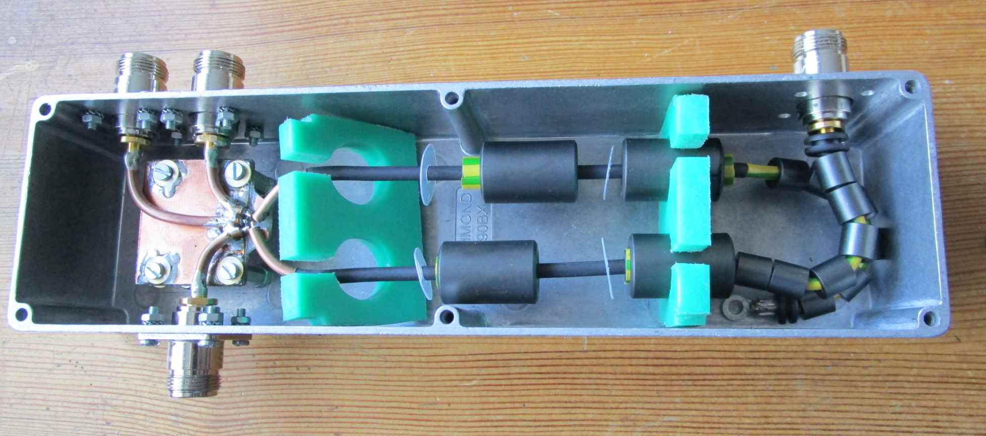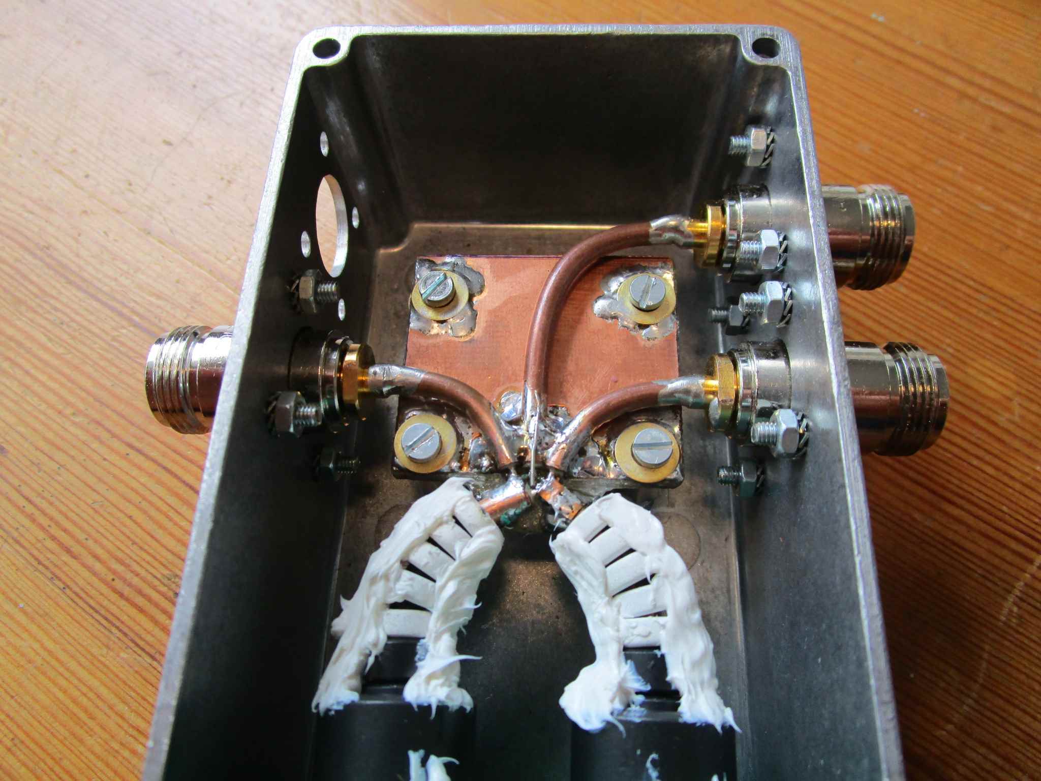 The PCB board is mounted, with 3 N-connectors with short pieces of coax